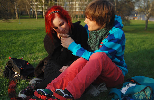 Booom! Kevät tuli ja iski meidän keuhkoistamme ilmat pihalle. Pihallehan sitä oli itsekin sitten päästävä. Keskelle vaaleanpunaisten kukkien ja kutittelevan auringonvalon. Ennen sitä urhea ritarini ajoi kotoani ulos sekä hämähäkin että ampiaisen. Tai oikeastaan ampiaisen liiskasin itse ikkunan väliin paniikissa. Hyi @_@